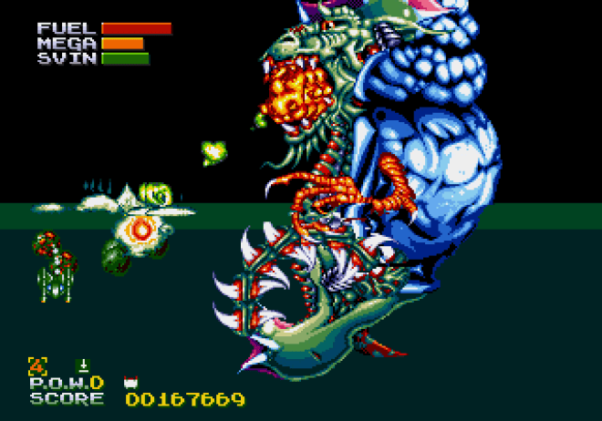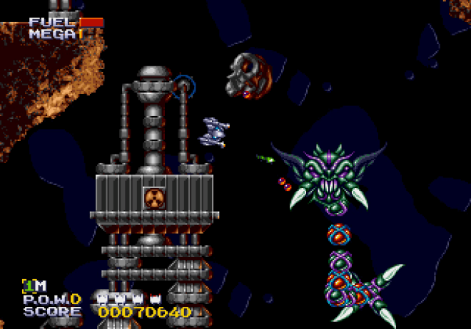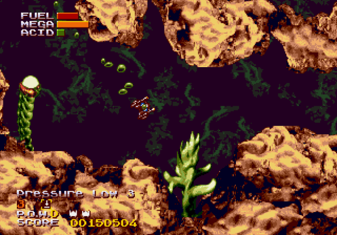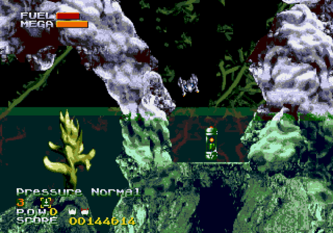Dans le domaine du shoot-them-up, les choses étaient même pratiquement gravées dans le marbre : les deux principales écoles opposaient le défilement vertical à la 1942 au défilement horizontal à la R-Type. Sortir de ces deux concepts revenait à s’extraire d’un moule dans lequel étaient formés 95% des shoot-them-up de l’époque. Alors autant dire que la surprise fut grande en voyant débarquer un extraterrestre comme Sub-Terrania, dont les mécanismes allaient puiser dans d’antiques références comme Asteroids ou Gravitar. Un choix osé, dans une période où la différence n’était plus forcément, comme on vient de le voir, un argument de vente. Mais les anciens demomakers sur Amiga de Zyrinx étaient bien décidés à faire les choses à leur manière, alors ils s’y seront attelés crânement, avec leur propre kit de développement, afin de montrer ce que la Mega Drive pouvait avoir dans le ventre.