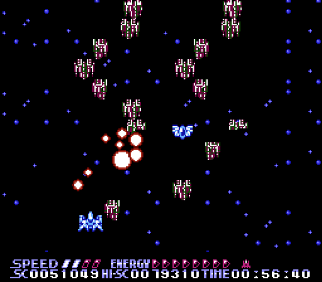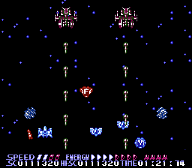 Mais le véritable exploit repose précisément sur la pléthore d’ennemis à l’écran : rappelons-nous qu’afficher plus de quelques sprites en même temps était une des principales limites de la NES, à tel point que la conversion de Gradius, par exemple, avait fait le choix de limiter le nombre de tirs et de satellites pour soulager le processeur de la console. Six ans plus tard, en tous cas, on en était visiblement très loin : il y a des tirs et des adversaires partout, dans tous les sens, tout le temps, classant clairement le jeu dans la catégorie du manic shooter (le jeu est d’ailleurs parfois considéré comme le tout premier représentant du genre, avant Batsugun ou DonPachi) sans l’ombre du plus minuscule ralentissement ! De quoi littéralement humilier des dizaines de titres similaires sur consoles 16 bits !