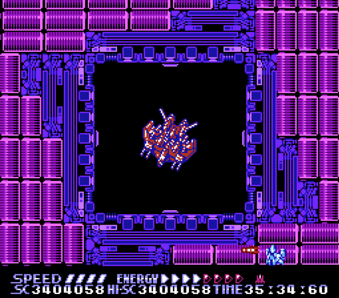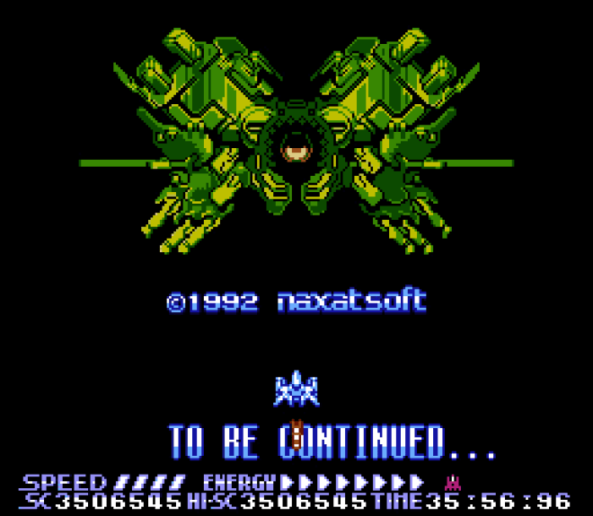 Naturellement, ce gameplay hyper-exigeant ne fera pas que des heureux, et les joueurs occasionnels risquent de jeter un coup d’œil par simple curiosité avant de prendre la fuite à toutes jambes. Les retrogamers à la recherche de la perle rare pourront en revanche sabrer le champagne, en découvrant un titre auquel ils auraient certainement rêvé de s’essayer au moment de sa sortie – mieux vaudra s’en remettre au Nintendo eShop, cependant, car autant dire que trouver une copie physique du jeu à un prix vaguement abordable aujourd’hui est totalement hors de question. Mais si jamais vous rêvez de voir enfin ce que votre NES a réellement dans le ventre, et d’en profiter pour découvrir l’un des shoot-them-up les plus impressionnants jamais publiés sur une machine strictement 8 bits, ne cherchez pas plus loin. En termes vidéoludiques, on appelle ça le Graal.