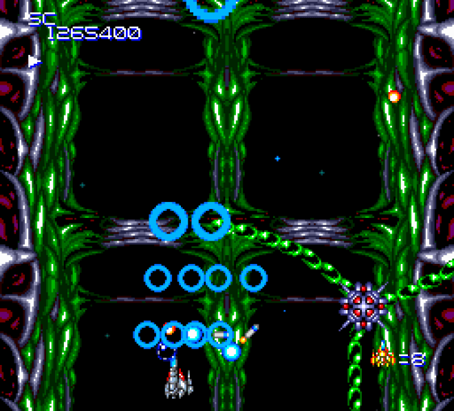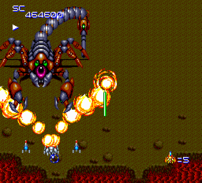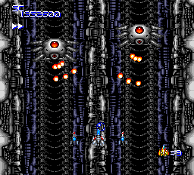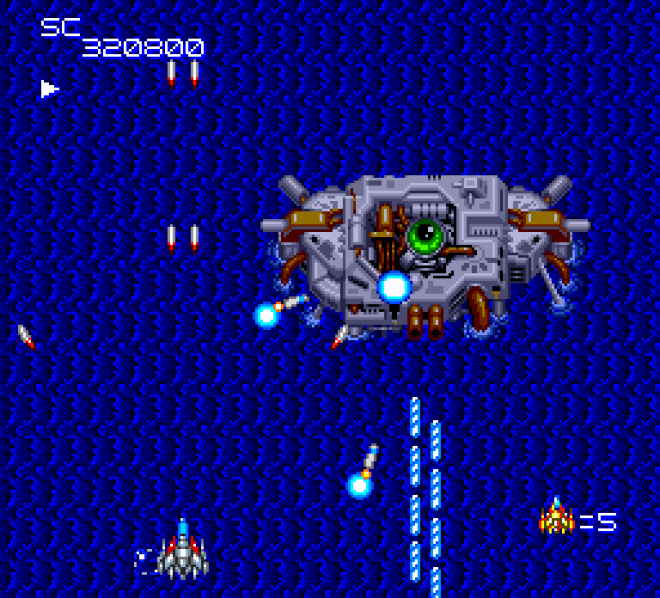 On notera également plusieurs passages faisant plus qu’énormément penser… à M.U.S.H.A., justement : vol dans une tranchée où se superposent plusieurs niveaux de défilements parallaxes, attaque d’une structure mobile avant de pénétrer à l’intérieur, scène de fuite avec des obstacles qui se placent sur votre route tandis que vous filez à toute vitesse… sans oublier le système d’upgrade. De nombreux points communs qui posent question, les deux titres ayant été développés par deux équipes différentes à une période similaire, mais le fait est que le logiciel de Compile, lui, est un peu plus riche dans ses mécanismes de jeu, visuellement plus original et globalement mieux équilibré.