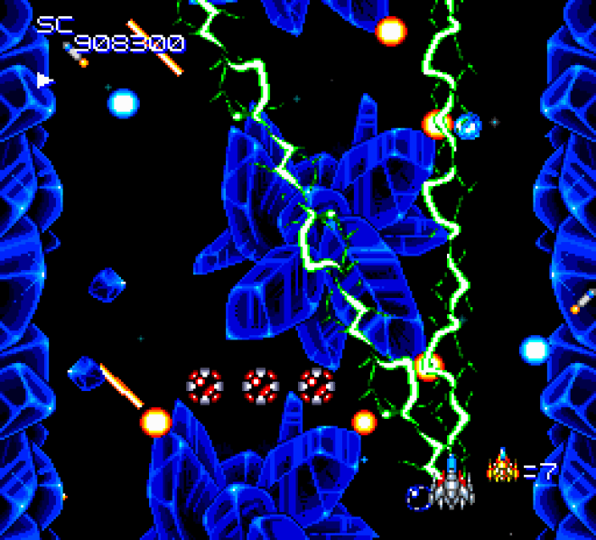 Le plus impressionnant reste sans doute la quantité hallucinante de sprites à l’écran : il n’est pas rare qu’y apparaissent des dizaines d’ennemis et encore deux ou trois fois plus de tirs, évoquant ainsi ce qu’on allait venir à désigner sous le nom de manic shooter ou de bullet hell. Ce n’est peut-être pas encore Batsugun ou Donpachi, mais croyez-moi ça sera déjà bien suffisant pour mettre vos réflexes autant que vos nerfs à rude épreuve. Il y en a partout, dans tous les sens, avec des passages pratiquement infranchissables sans essuyer au moins un ou deux tirs, et vous allez vite apprendre à bénir les power-up autant pour le gain de puissance qu’ils représentent que pour le fait qu’ils composent également l’équivalent de vos points de vie. Autant le dire tout de suite, les chances de survie avec le petit tir de base sont de l’ordre du néant. Mais si vous aimez l’adrénaline, alors là, il y a de quoi en avoir !