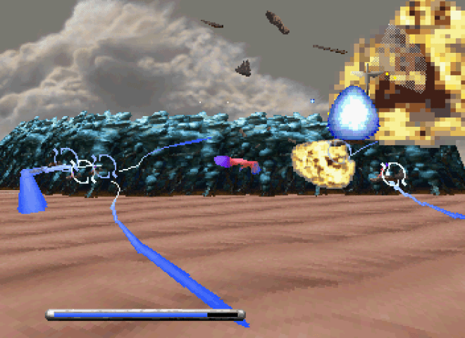 Plus original encore : rien ne vous oblige à regarder droit devant vous : les boutons de tranche du joypad feront pivoter la vue par incréments de 90°, vous laissant faire face à ce qui pourrait venir de n’importe quel côté – et histoire de ne pas passer votre temps à regarder partout à la recherche d’ennemis, un radar en haut à droite a l’excellente idée de vous tenir informé de la position des adversaires ET de leurs projectiles en temps réel. Dernier raffinement : en maintenant le bouton de tir appuyé, il est possible de « verrouiller » les adversaires et de lâcher une salve de tirs à tête chercheuse qui pourront facilement vous débarrasser de l’opposition – à condition, donc, d’avoir sacrifié quelques précieux dixième de secondes à arrêter de tirer le temps d’acquérir vos cibles. En résumé : juste ce qu’il faut pour rendre le gameplay plus intéressant et moins limité sans pour autant en faire une usine à gaz avec trop de critères à prendre en compte. Un bon début.