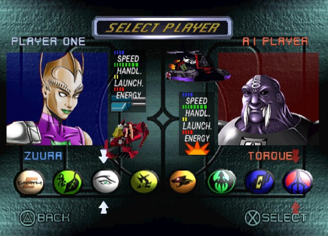 Un mode entraînement, des matchs libres, la possibilité d’affronter un ami – du classique, et pour ainsi dire le B.A.-BA, mais le vrai plat de résistance sera le mode tournoi qui vous permettra à la fois de découvrir les nouveautés du gameplay en éliminant tous vos adversaires au fil de douze matchs en deux rounds gagnants, mais aussi de débloquer du contenu pour les autres modes évoqués plus haut. Des adversaires ? Oui, car désormais vous ne serez plus uniquement aux commandes d’un « Rotofoil » désincarné : vous commencerez par choisir votre avatar parmi huit personnages, chacun disposant à la fois de son propre véhicule (ce qui vous permettra de savoir à qui vous avez affaire) et surtout de ses propres caractéristiques. Car vous allez vite constater qu’il y a désormais des subtilités à prendre en compte dans Ballblazer Champions : au hasard, la puissance de votre lancer de balle – fini, les tirs de loin dès le début de la partie – la vitesse et la maniabilité de votre véhicule, mais aussi et surtout sa résistance. Car oui, désormais le sport évoquant du football en un contre un et en machine du futur a décidé de se la jouer sale.