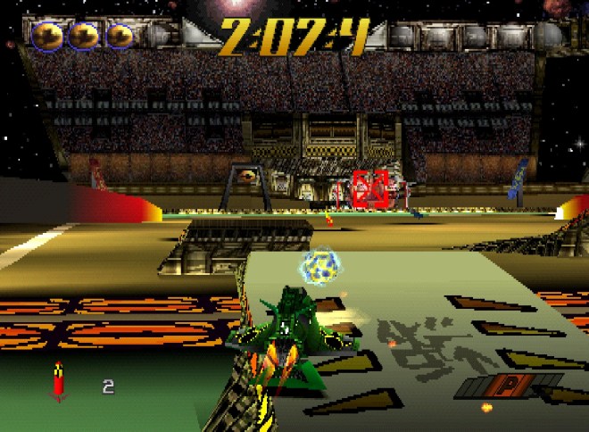 Si les règles n’ont pratiquement pas changé, la première nuance de taille est donc dorénavant l’inclusion d’armes et de bonus histoire que les balles disputées ressemblent un peu moins à des séances d’auto-tamponneuses. Mines, missiles à tête chercheuse, mitrailleuse, mais aussi bouclier ; tout les moyens sont bons, à présent, pour aller s’emparer de la sphère d’énergie – d’autant qu’un turbo alimenté par une jauge présentée en bas à droite de l’écran et pouvant être rechargée en passant sur certaines zones dispatchées sur le terrain viendra également vous offrir une chance supplémentaire de filer sans opposition vers le but adverse.