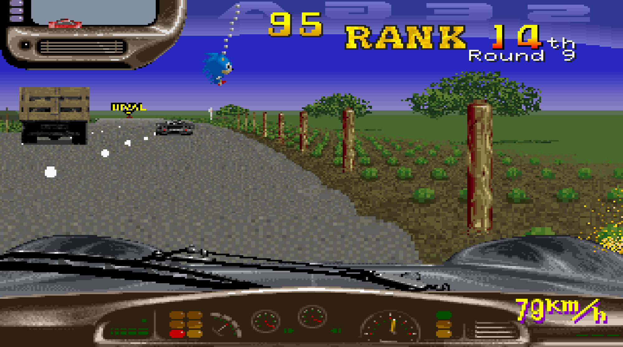 De la même manière que G-LOC : Air Battle avait commencé par camoufler timidement sa filiation évidente avec After Burner en changeant le point de vue, le programme vous impose ici une « vue cockpit » qui restera surtout célèbre pour avoir été la première à vous permettre… de découvrir la nouvelle mascotte de chez SEGA, un hérisson bleu appelé à devenir célèbre, et qui aura donc débuté sa carrière sous la forme d’une peluche accrochée au rétroviseur ! Pour le reste, on remarquera l’introduction de certaines petites spécificités déjà utilisées dans d’autres jeux de course, mais qui viennent ici pimenter (un peu) le déroulement : la présence d’une circulation à double-sens, l’existence de raccourcis vous permettant, par exemple, d’aller rouler sur des rails en vous faisant pousser par le train, et surtout l’intervention de forces de l’ordre vous prenant en chasse et s’efforçant de vous faire barrage, ce qui se traduira en cas de réussite par… une perte de quelques secondes avant de vous laisser repartir.
