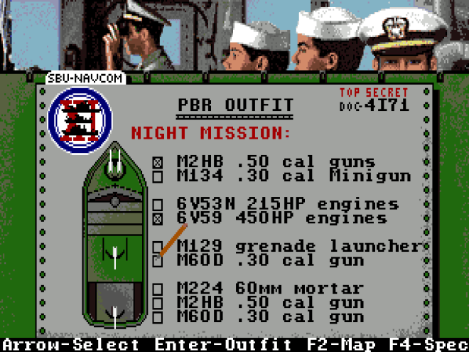 Ne vous attendez pas, en revanche, à de la mise en situation géopolitique de pointe : vous êtes là pour casser du Vietcong ou du narcotrafiquant, pas pour méditer sur la vanité de la violence humaine. Saluons en tous cas la volonté d’accessibilité du titre, qui vous propose d’emblée trois missions d’entrainement pour vous roder aux différents postes que vous pourrez être amené à occuper dans votre bateau : le siège du pilote, celui du mitrailleur ou celui de l’artilleur. Après quoi, une fois que vous vous sentirez à l’aise (comptez dix minutes maximum, le temps de compulser et d’assimiler la carte des touches fournies avec le jeu), vous pourrez lancer la campagne et vous frotter à des missions de plus en plus difficiles.