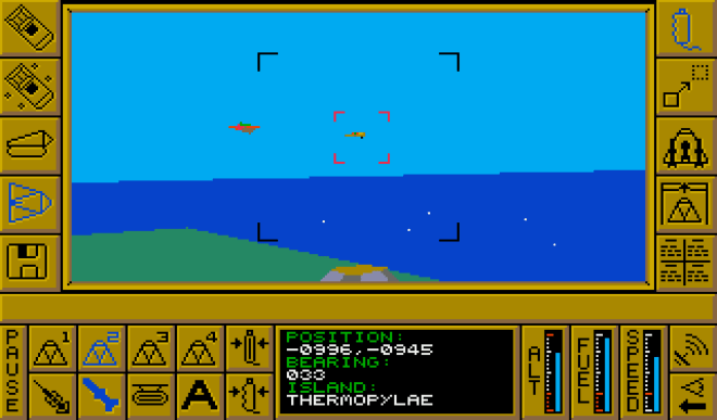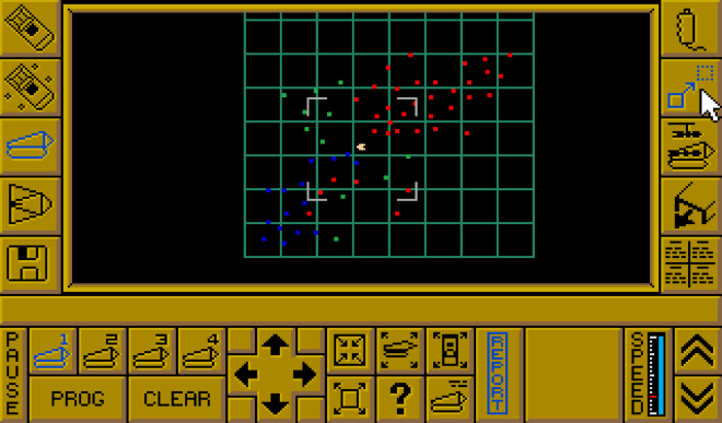 Autant vous prévenir tout de suite : préparez-vous à passer au minimum un bon quart d’heure avec le manuel sur les genoux, lors de votre première partie, à détailler les très nombreuses fonctions d’une interface quelque peu intimidante. Les possibilités du jeu sont déjà particulièrement grisantes pour un titre de 1988 : vous pouvez contrôler à distance des unités amphibies pour les envoyer construire des centres de contrôle sur les îles, piloter des unités aériennes, lancer des drones en guise d’éclaireurs, prendre le contrôle de la tourelle de votre navire, tirer des contre-mesures pour échapper aux missiles adverses…