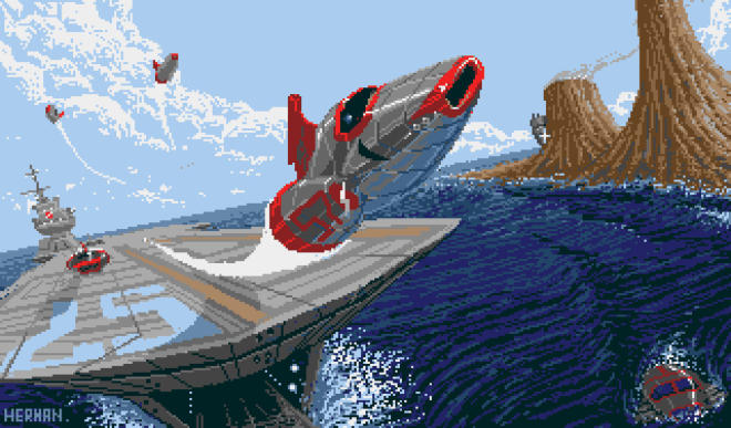 On retrouve en tous cas un contenu sensiblement mieux agencé, avec briefing et choix de la mission, plus un pilote pour vous délivrer vos ordres, mais rien de l’aspect « gestion » présent dans les versions 8 bits, ce qui est un peu dommage. Pas de boss non plus, d’ailleurs. En revanche, les séquences « à la troisième personne » font désormais l’objet de niveaux entiers, et on retrouve les rase-motte dans les canyons, avec la possibilité de s’écraser misérablement contre les falaises. La jouabilité est globalement assez précise, sauf pour la mitrailleuse qui demande vraiment d’être pointée précisément au centre de la hitbox adverse pour avoir une chance de toucher, ce qui est toujours aussi énervant. Le son, passé le sympathique thème de l’écran-titre, ne casse pas trois pattes à un canard. Bref, on a là l’essentiel, mais vraiment pas grand chose de plus, ce qui fait que le titre pourra faire illusion lors de courtes séances de jeu mais que dans l’ensemble, on s’amuse plus sur la version arcade, et même sur la version Master System.