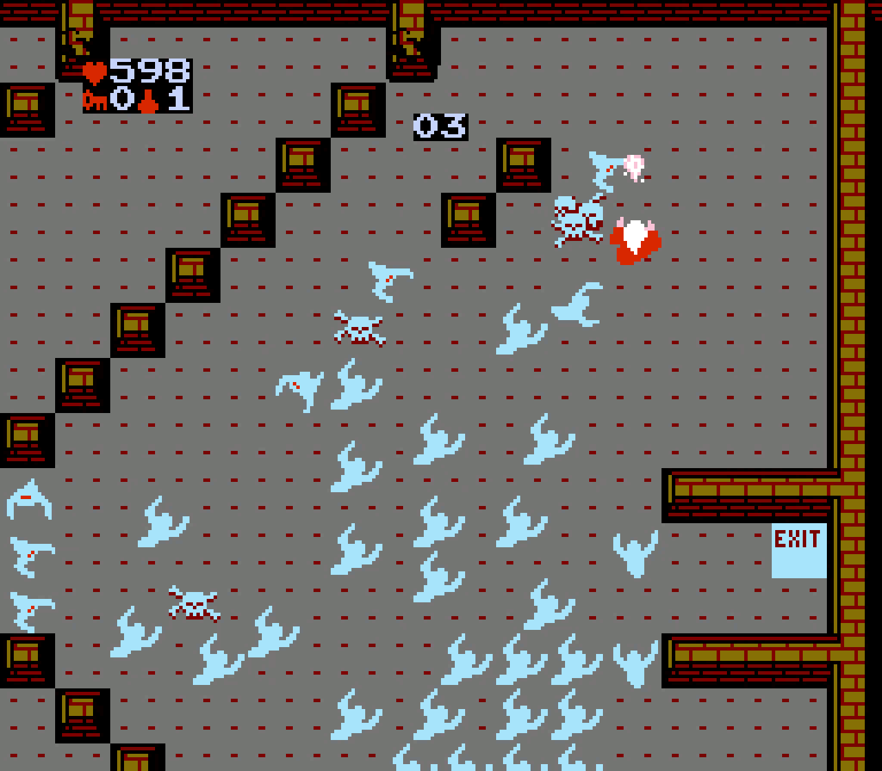 Tous vos personnages sont capables d’attaquer à distance, et vous allez en avoir besoin tant le jeu peut rapidement tendre vers le run-and-gun : l’opposition est constante, en flux tendu, quasi-intarissable. En plus de la nourriture et des trésors, vous pourrez également mettre la main sur des clés vous servant à ouvrir les portes, sur des potions que vous pourrez conserver et qui vous permettront de nettoyer l’écran (ce qui peut souvent être très pratique), mais aussi sur des bonus permanents augmentant vos dégâts, votre vitesse ou votre résistance, et qui feront votre bonheur jusqu’à ce qu’un des voleurs du jeu ne parvienne à vous les piquer (ils ont pensé à tout, chez Atari !).