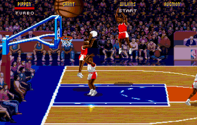 Ladite voie à suivre correspondait plutôt à celle qui avait toujours fait le succès de n’importe quelle borne : accessibilité, réalisation ébouriffante, adrénaline, et tant qu’à faire : jeu à plusieurs, tant deux ou quatre joueurs glissant une pièce dans la fente valent toujours mieux qu’un seul. Cette philosophie avait d’abord abouti à des jeux de football américain très typés arcade : High Impact Football et sa suite, Super High Impact, n’auront évidemment eu qu’un retentissement très limité en-dehors du pays de l’Oncle Sam, le sport mis en scène n’intéressant à l’époque pas grand monde au-delà des États-Unis. Alors quitte à remettre le couvert, on s’orienta vers un sport plus populaire : le basketball. Et histoire d’arriver avec une certaine légitimité, on récupéra carrément la licence – et avec elle, l’image et les noms des basketteurs – de la NBA. Ainsi naquit NBA Jam, carton immédiat et monstrueux dans les salles d’arcade… et au-delà.