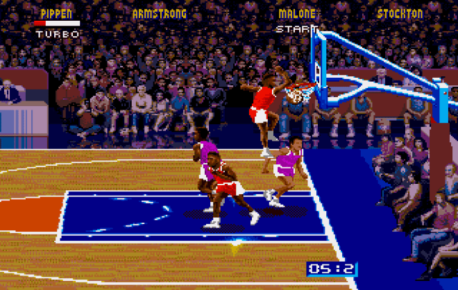 Oubliez les équipes de cinq, oubliez les lancers francs, oubliez les fautes, oubliez les reprises de dribble et à peu près tout le reste : en-dehors des lancers à trois points, on est vraiment face à la forme la plus pure du sport. Trois boutons permettent de réaliser les trois actions du jeu : le turbo pour les contre-attaques éclairs, le tir et la passe (qui devient l’interception en phase défensive). Maintenez le turbo et le bouton de tir sous la raquette, et vous verrez votre basketteur partir dans un saut totalement improbable de deux mètres de haut pour claquer un dunk impressionnant, et parfois exploser le panier, voir même y mettre le feu (!) – un bon indice de ce en quoi va consister l’essence du jeu : de l’action, du spectacle, et surtout, du fun.