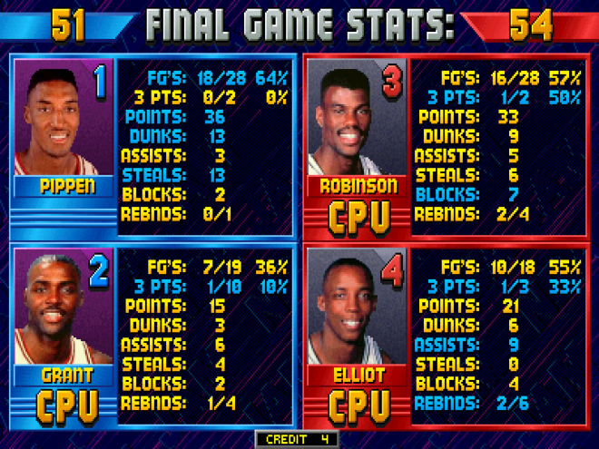 On appréciera les petites finesses, comme le fait qu’un joueur ayant marqué trois paniers d’affilée sans que l’équipe adverse n’en marque devienne alors « en feu » et puisse sortir des coups encore plus impressionnants. Mais là où les choses deviennent encore meilleures, c’est quand on constate la pléthore de bonus et autres modes cachés qui s’ouvre aux joueurs curieux ou bien informés : en rentrant certains noms et certaines dates lors de l’écran de sélection des joueurs, il est ainsi possible de débloquer une quinzaine de joueurs différents qui viendront ainsi grossir une liste déjà copieuse. On peut même jouer avec des têtes démesurées, ou lancer un mini-jeu de tank en 3D ! Des ajouts qui ne compenseront hélas pas l’absence d’invités de marque, le plus évident étant Michael Jordan, non gardé dans la version finale du jeu puisqu’il venait de quitter la NBA pour prendre sa retraite (il allait reprendre du service en 1995). Mais un contenu dantesque pour une borne d’arcade, et largement de quoi garder des joueurs occupés pendant des semaines, sinon des mois.