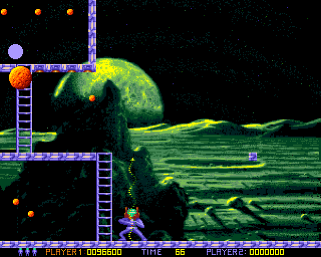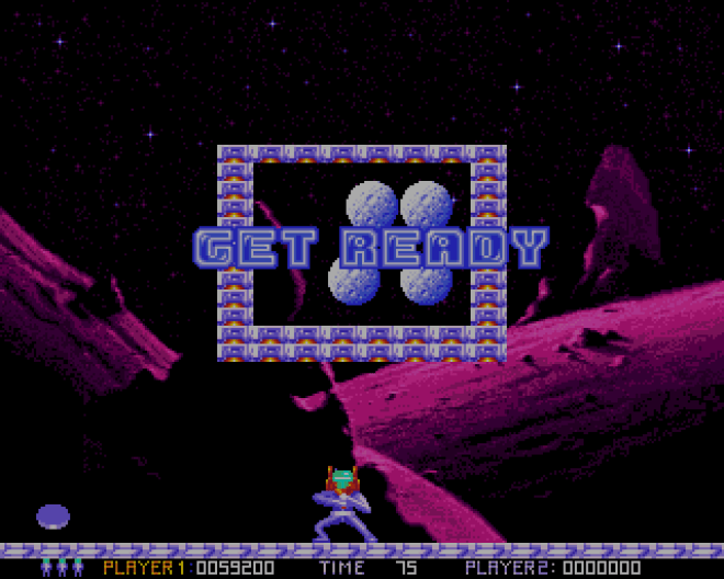 Pour ce qui est du jeu en lui-même, dès l’instant où vous connaissez Pang, les choses vont aller vite : remplacez les ballons par des astéroïdes, ajoutez l’obligation à chaque niveau d’aller chercher une pièce correspondant à un morceau du vaisseau spatial des héros (le prétexte étant, vous l’aurez compris, de le reconstituer), et vous aurez votre jeu 100% original avec ses quelques cent niveaux !