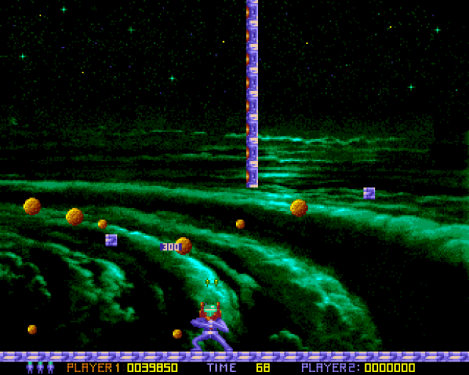Tous les bonus de Pang sont là à l’identique, plus quelques malus dispensables (commandes inversées, paralysie, et même mort immédiate) et quelques très très rares idées originales (des téléporteurs, l’ajout de la problématique des pièces à récupérer), mais dans l’ensemble c’est exactement la même chose avec un coup de peinture par-dessus – ça tombe bien, on sent que c’était précisément l’objectif (c’est moi ou les équipes de développement allemandes tendaient à être vraiment fâchées avec le concept de propriété intellectuelle, à l’époque ?). Reconnaissons au moins que dans le domaine, le travail est fait correctement : même s’il faut aimer les décors monochromes invariablement placés sur un fond noir étoilé, la réalisation est très correcte, il est toujours possible de jouer à deux et la jouabilité est très proche de celle de la borne. En revanche, la difficulté est encore plus raide, même si cela est compensé par la présence d’un mot de passe à chaque niveau, ce qui offrira au moins une petite chance aux joueurs n’ayant pas envie de s’entraîner pendant des mois pour boucler le jeu au bout de deux heures d’effort.