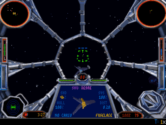 La 3D en jeu a l’avantage d’être relativement lisible et détaillée, et transmets parfaitement cette sensation d’être au milieu d’un champ de bataille où notre vaisseau ne représente qu’un infime rouage au milieu d’une gigantesque opération – soit un des aspects que Wing Commander, justement, n’était jamais réellement parvenu à rendre. En dépit de quelques missions redoutables, la possibilité de choisir son mode de difficulté – voire carrément de se rendre invincible sans que cela empêche de valider la mission comme c’était le cas dans le premier opus – devrait permettre à chacun de se forger une expérience sur mesure sans avoir à composer avec la frustration. Bref, c’est long, c’est riche, c’est passionnant, c’est original ; rien de surprenant, donc, à ce que de nombreux joueurs considèrent TIE Fighter comme le pinacle absolu de ce qu’a pu produire la licence STAR WARS dans le domaine vidéoludique. Que vous ayez adoré X Wing ou que vous l’ayez trouvé un peu trop dur à votre goût, essayez TIE Fighter : en termes de simulation, on n’a peut-être jamais fait mieux.