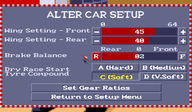 Depuis les indispensables réglages de votre véhicule (hauteur des ailerons, équilibrage des freins, amplitude des rapports de la boîte de vitesse, type de pneus…) aux qualifications, depuis les derniers essais jusqu’à la course proprement dite, sans oublier l’indispensable championnat qui vous permettra bien évidemment de vivre la saison dans son intégralité, avec tous les circuits fidèlement modélisés et les couleurs des écuries respectées (pas les noms des pilotes, hélas) – autant dire que vous allez avoir de quoi faire. Intimidant ? Certes, un peu, mais la grande force du jeu est surtout de vous offrir une expérience totalement paramétrable : entre les très nombreuses aides à la conduite activables ou désactivables à tout moment, et qui vont d’un véhicule invulnérable qui se conduit presque tout seul à la simulation la plus poussée, et la possibilité de choisir le niveau de vos adversaires ou la durée des courses, chaque joueur pourra se façonner une partie sur mesure sans avoir à gérer des dizaines de facteurs dès sa première partie.