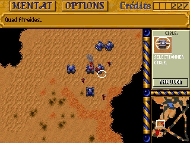 Tout d’abord, et même si on peut saluer l’accessibilité du titre qui, faute de vous proposer un tutoriel, commence par ne vous laisser l’accès qu’à quelques unités et bâtiments avant d’élargir l’offre au fur et à mesure des missions (un procédé aujourd’hui banal, mais Dune II était certainement l’un des tous premiers jeux à fonctionner de la sorte), la plupart des fonctionnalités qui apparaîtraient évidentes aujourd’hui n’existaient tout simplement pas en 1992.
