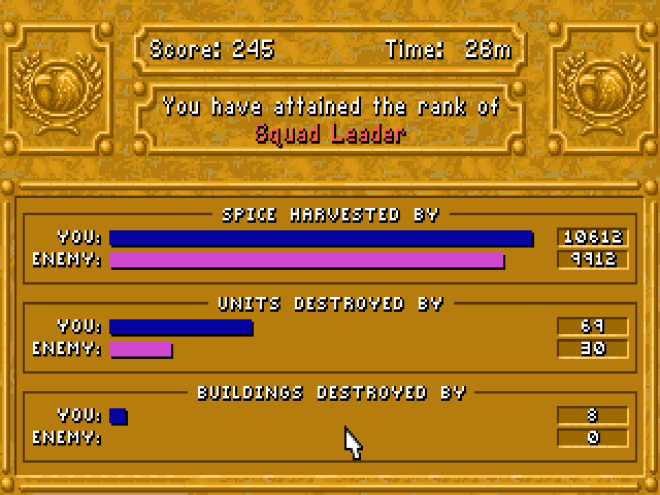 La victoire, parlons-en : nous sommes ici à la naissance d’un genre que l’on qualifiera plus tard de STR (Stratégie en Temps Réel), les objectifs sont donc encore très limités : si les deux premières missions, quel que soit votre camp, vous proposent de ramasser une certaine quantité d’Épice, les sept autres (il y a neuf missions par camp) vous demanderont invariablement d’aller raser la (ou les) base(s) adverse(s). Ce que vous serez sans doute tenté d’entreprendre selon la bonne vieille méthode du « je fais un paquet d’unités et je les envoie dans le camp d’en face », sauf que cela pourrait se révéler plus complexe que prévu.