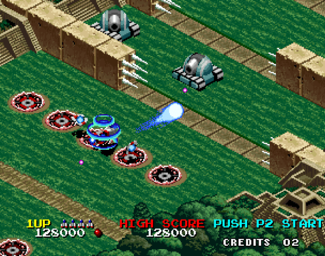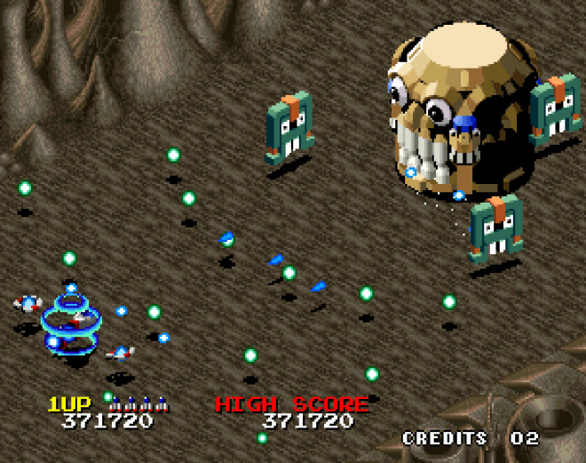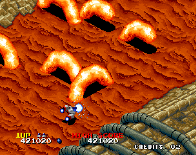 Pour conventionnel qu’il soit dans ses fondements, le gameplay du jeu ne tarde pas, en effet, à se montrer aussi exigeant qu’il est technique. Face à l’opposition pléthorique qui va se charger de faire de votre vie un enfer, le salut passera principalement par une chasse aux bonus, présentés sous la forme de lettres et dont vous pouvez changer la nature en tirant dessus. L améliore votre tir principal, M vos missiles (pour les cibles au sol), G fait office de monnaie pour investir dans une armure à la fin du niveau, S augmente votre vitesse, K vous permet de conserver tous vos power-up à la perte d’une vie, et ainsi de suite. Autant dire que mieux vaudra bien faire son choix, car si votre vaisseau doit par exemple avoir pour première priorité d’augmenter sa vitesse (la plupart des tirs adverses étant plus rapides que lui), aller trop vite risque en revanche de le transformer en savonnette incontrôlable.